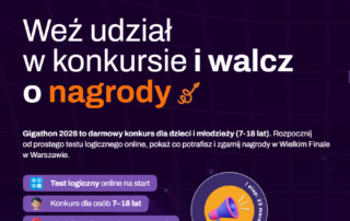 Ogólnopolski Konkurs Matematyczno-Informatyczny “Gigathon” Zapraszamy do udziału w Ogólnopolskim Konkursie Matematyczno-Informatycznym “Gigathon”. Skierowanym jest on do uczniów szkół podstawowych i ponadpodstawowych i jest CAŁKOWICIE BEZPŁATNY. 2. Konkurs został objęty patronatem honorowym Ministra Edukacji, a także Politechniki Warszawskiej - Wydziału MiNI. 3. Zapisy oraz szczegóły wydarzenia dostępne są na stronie www.gigathon.pl Każdy uczestnik musi zostać