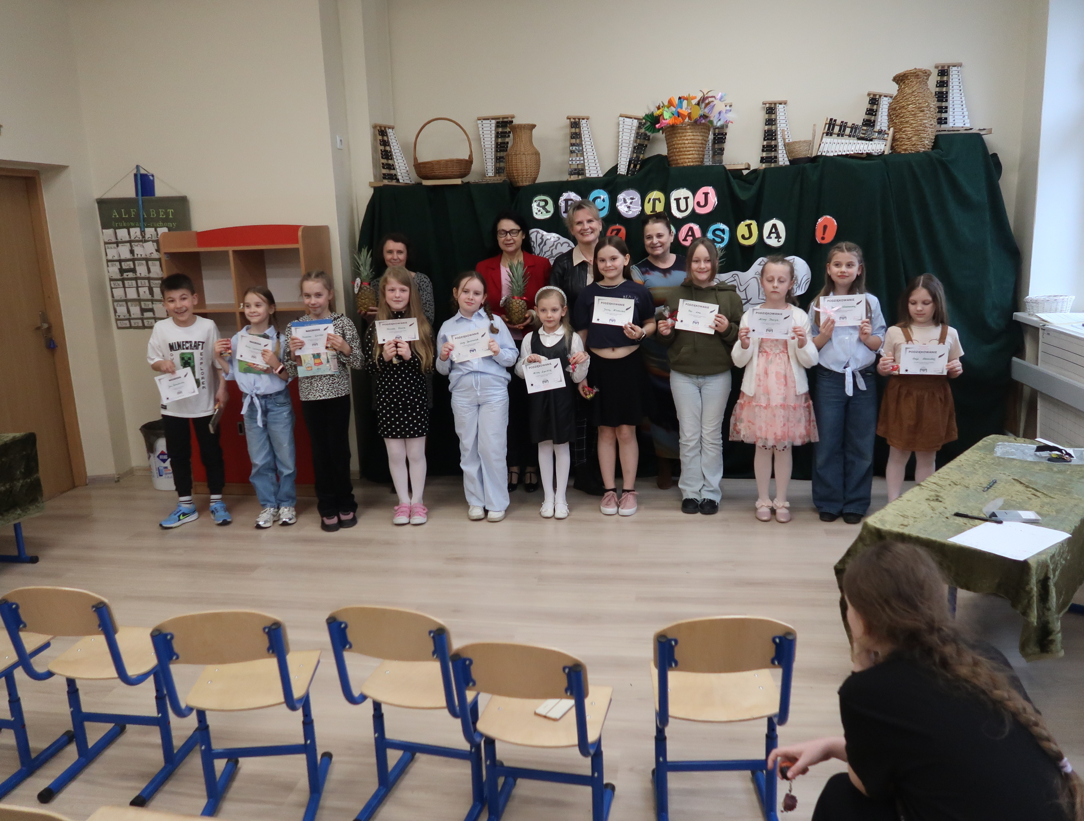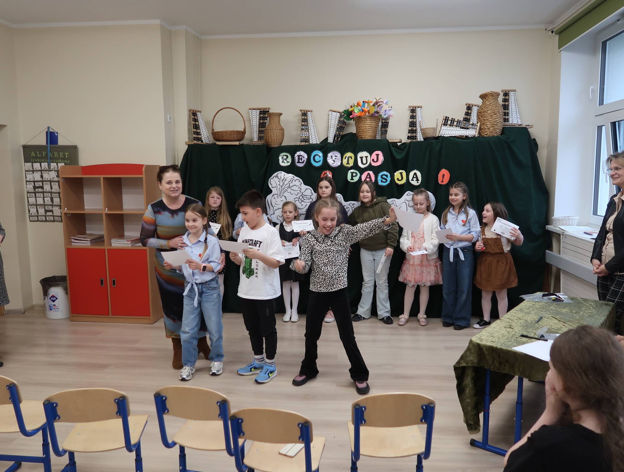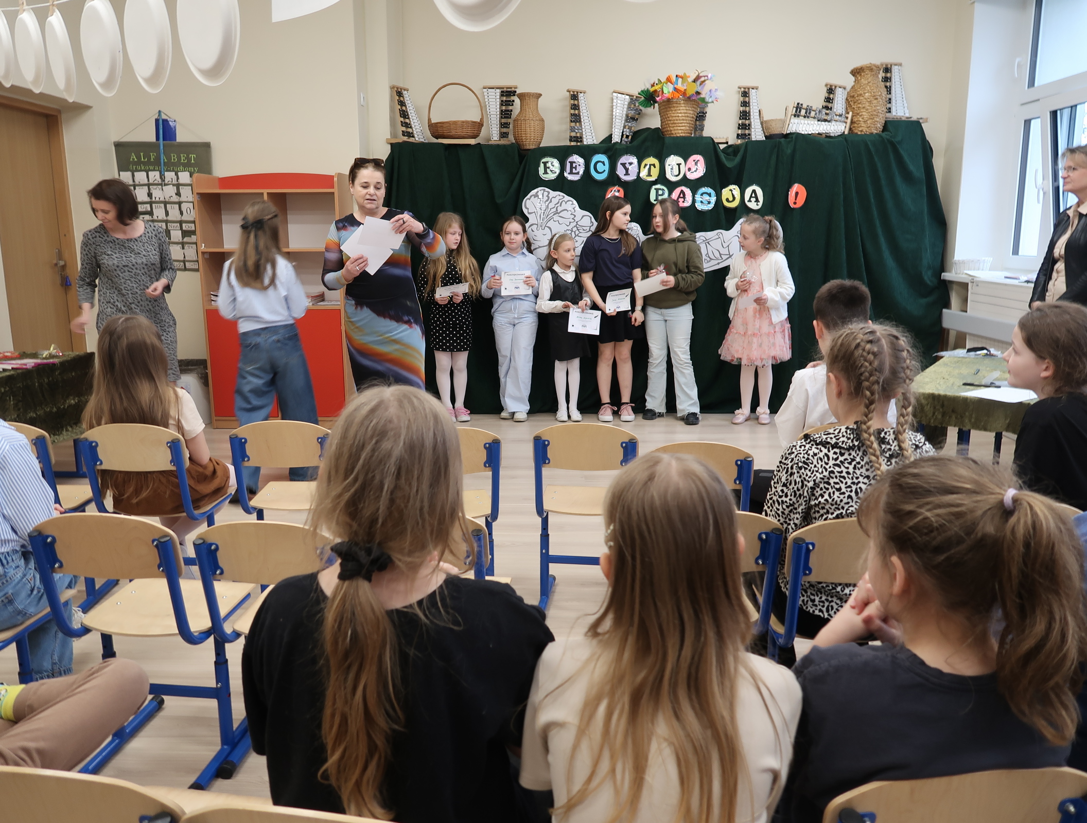 8 kwietnia 2026r.spotkaliśmy się ” ucho w ucho” z poezją polską dla dzieci młodszych. Każdą klasę reprezentowało dwóch recytatorów, których zadaniem było wyrecytowanie wybranego utworu polskich poetów. Na scenie usłyszeliśmy głównie klasykę poezji- wiersze Jana Brzechwy, Juliana Tuwima i Marii Konopnickiej. Uczniowie sięgnęli również po utwory Agnieszki Frączek. Jury wyłoniło troje zwycięzców, ktrórzy będą reprezentować naszą szkołę w konkursie międzyszkolnym. Są nimi- Hania Cymańska z 1b, Janek Szkudlarek z 2b i Zuzia Garstka z 3a. Dziękujemy wszystkim recytatorom i serdecznie gratulujemy.