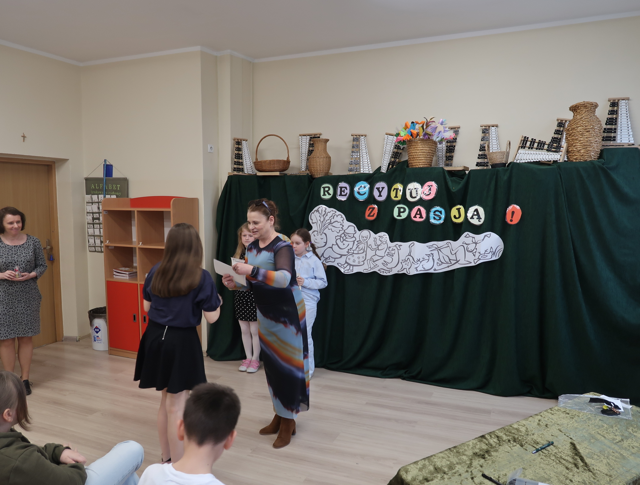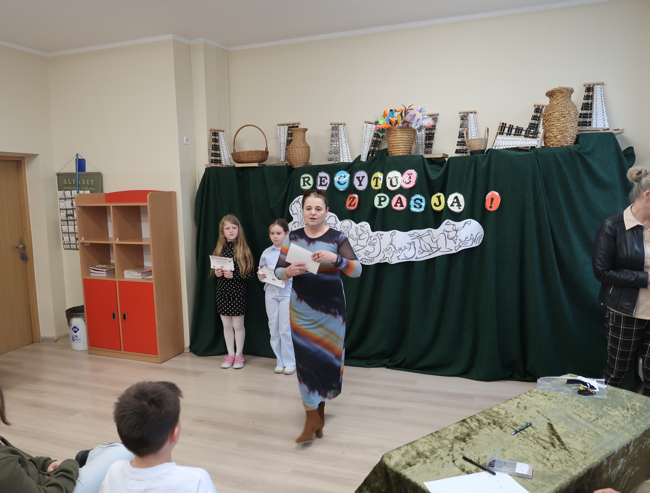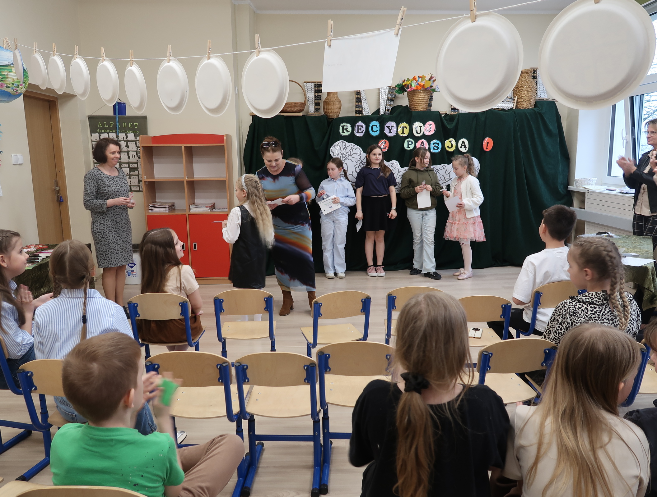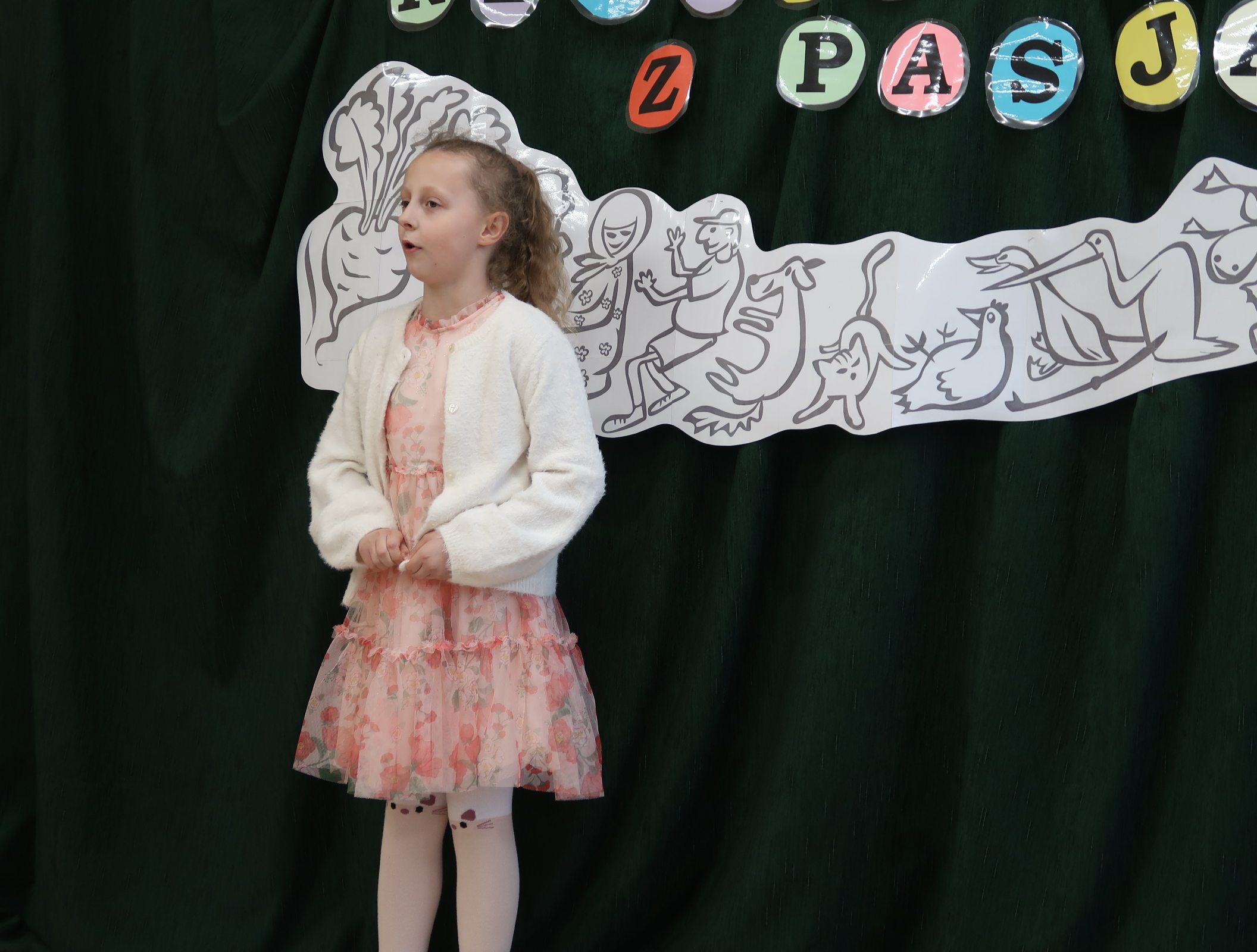 8 kwietnia 2026r.spotkaliśmy się ” ucho w ucho” z poezją polską dla dzieci młodszych. Każdą klasę reprezentowało dwóch recytatorów, których zadaniem było wyrecytowanie wybranego utworu polskich poetów. Na scenie usłyszeliśmy głównie klasykę poezji- wiersze Jana Brzechwy, Juliana Tuwima i Marii Konopnickiej. Uczniowie sięgnęli również po utwory Agnieszki Frączek. Jury wyłoniło troje zwycięzców, ktrórzy będą reprezentować naszą szkołę w konkursie międzyszkolnym. Są nimi- Hania Cymańska z 1b, Janek Szkudlarek z 2b i Zuzia Garstka z 3a. Dziękujemy wszystkim recytatorom i serdecznie gratulujemy.